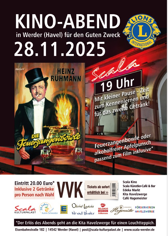 Für den gemütlichen Filmabend setzen die Lions Potsdam-Sanssouci schonmal die Feuerzangenbowle an. Doch nicht nur die darf probiert werden. Im SCALA lassen die Lions am 28. November ab 19 Uhr natürlich auch die Filmkomödie von 1944 mit Heinz Rühmann in der Hauptrolle laufen. Mit dem passenden Getränk in den Kinosessel gekuschelt, verspricht der Abend in Werder einen perfekten Start in das erste Adventswochenende.
